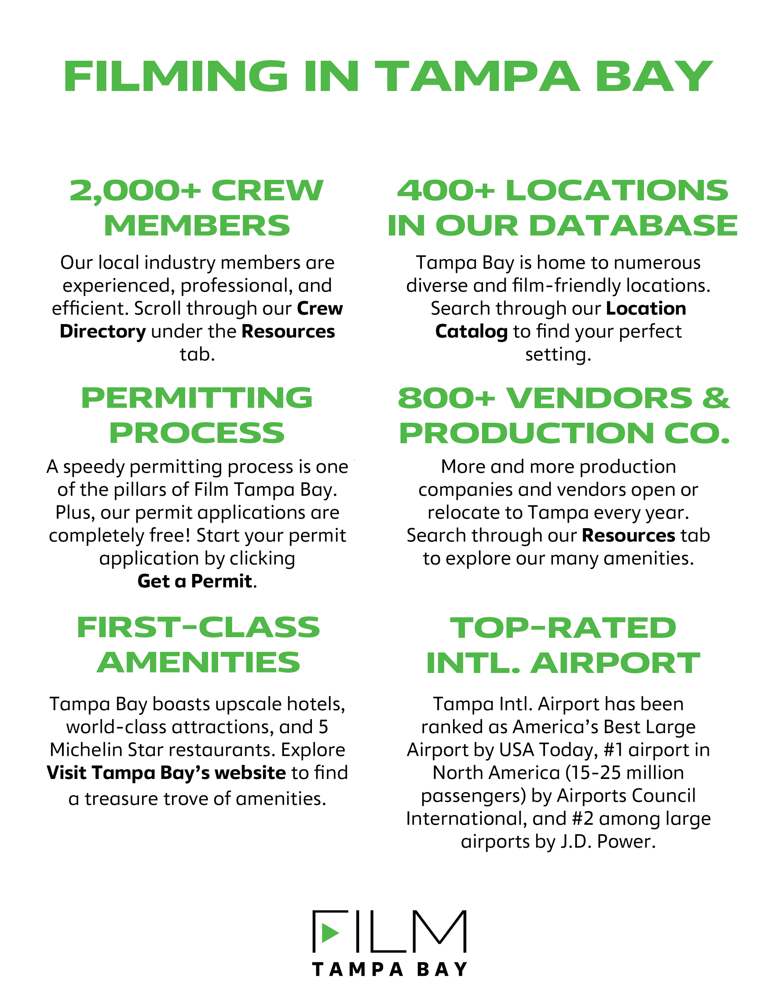 Tampa Bay, Florida has everything you need for your next production. With over 2,000+ experienced industry members, 400+ film-friendly locations, and 800+ production companies and vendors, Tampa Bay is the perfect backdrop for your next project. Take a look at our Filming in Tampa Bay cheat sheet below and reach out if you have any questions!